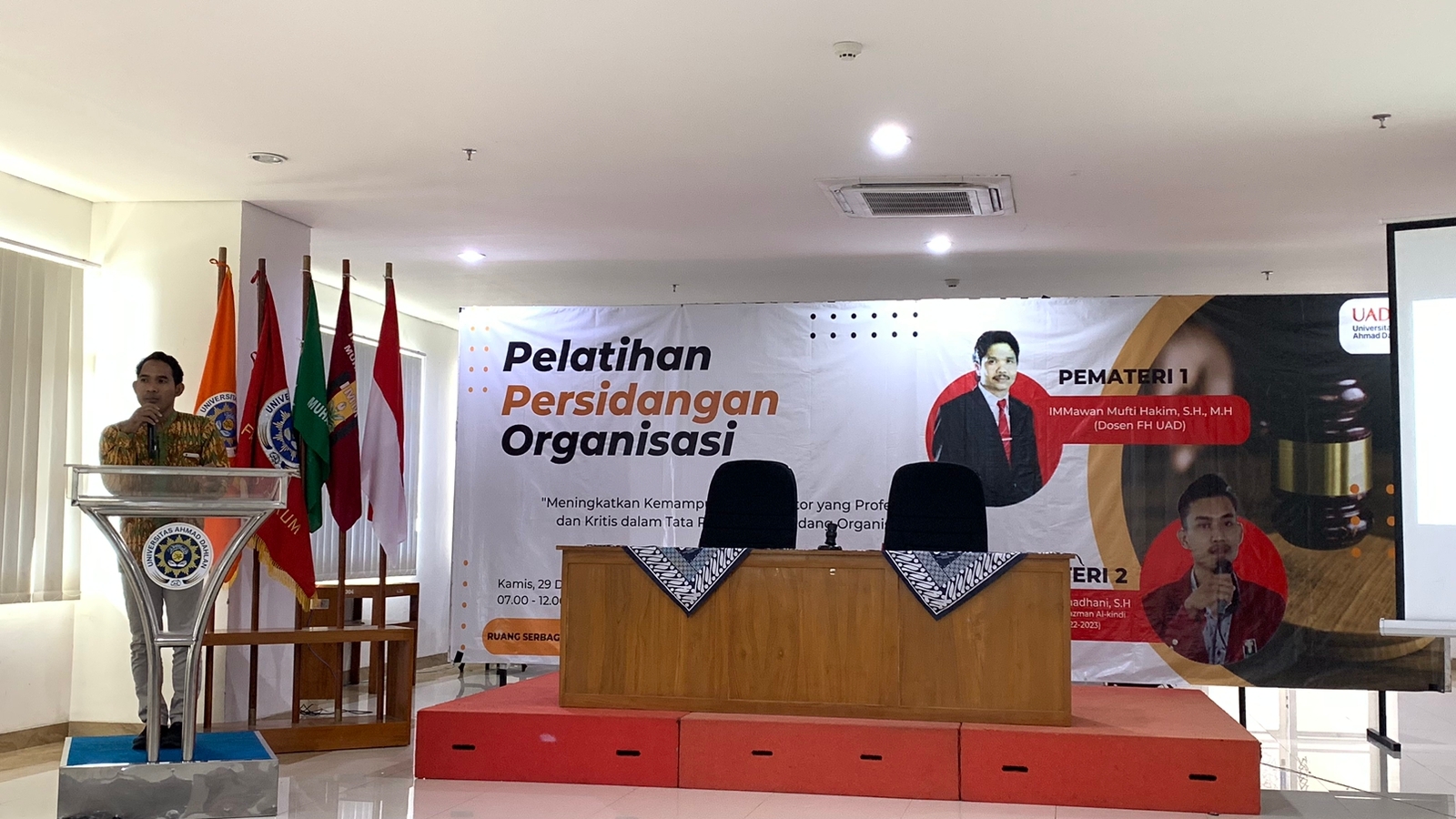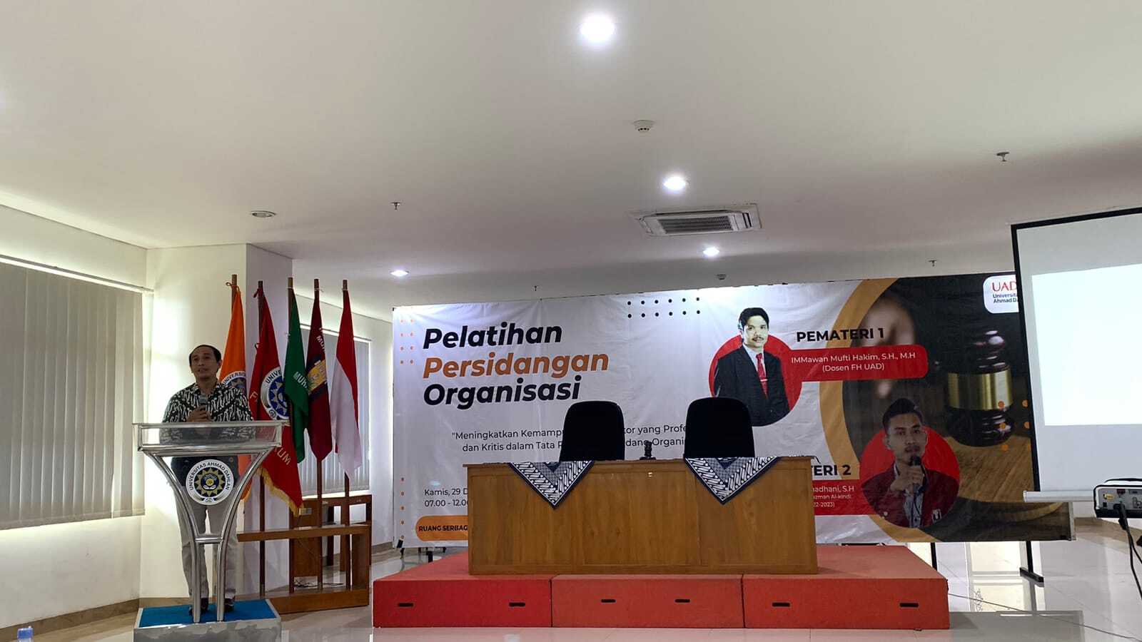Yoyga, 29/12/2022 Ikatan Mahasiswa Muhammadiyah Komisariat Fakultas Hukum Universitas Ahmad Dahlan (FH UAD) menyelenggarakan Pelatihan Persidangan pada Hari Kamis 29 Desember 2022 bertempat di Lt 10 Kampus 4 UAD. Pada pembukaan hadir Wakil Rektor Bidang Sumberdaya Manusia (SDM UAD) Dr. Normasari, S.H., M.Hum, Dekan Fakultas Hukum Dr. Hj. Megawati, S.H., M.Hum, Wakil Dekan Bidang Kemahasiswan Nurul Satria Abdi, S.H., M.H. Pembimbing IMM Komfak Hukum Muhammad Habibi Miftahul Marwah, S.Hi, M.H acara diikuti oleh seluruh kader IMM FH UAD.